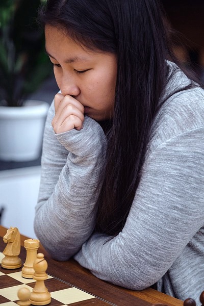 MJ had White in game 2 (below). She got a difficult position out of a Nimzo-Rubinstein, and eventually got tangled up defending against Black's pressure on her weak queenside pawns.