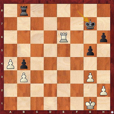 Black K on b8, forcing ...h5.}) 39... Rb5 40. a6 (40. Rb6 $2 Rxa5 41. Rxb4 Ra1+