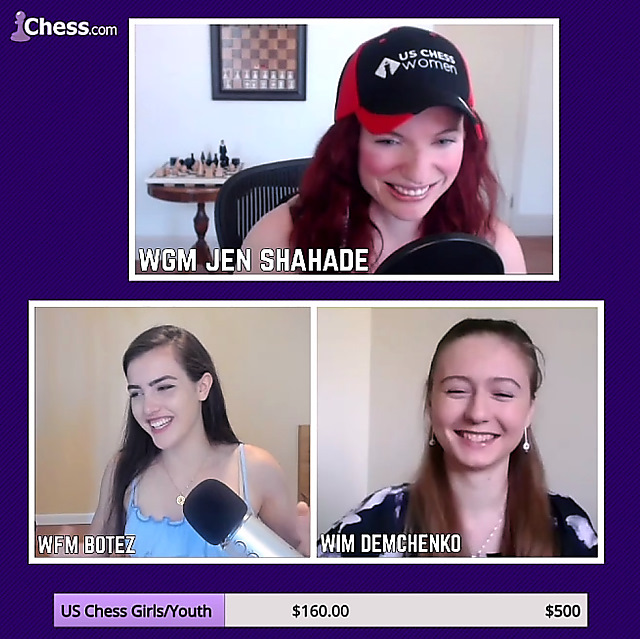 In addition to the Chessbrah Invitational, WFM Alexandra Botez has been hosting weekly matches between women players, with a large part of the proceeds (including donations from online viewers) going to support US Women's Chess. Previously, she had played two matches against WGM Qiyu Zhou, and in April she played a first-to-ten match against WIM Svitlana Demchenko, withe live commentary by WGM Jen Shahade (see photo). The match was both for fun and charity, but also served as an unofficial proxy for the 2020 Canadian Women's Zonal, which both players had entered before it was cancelled due to the lockdown.