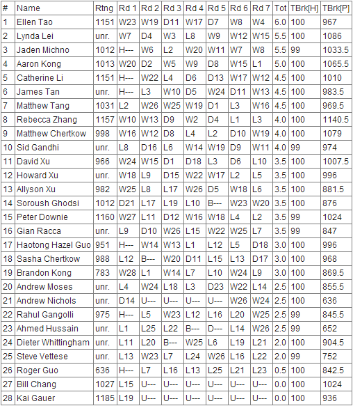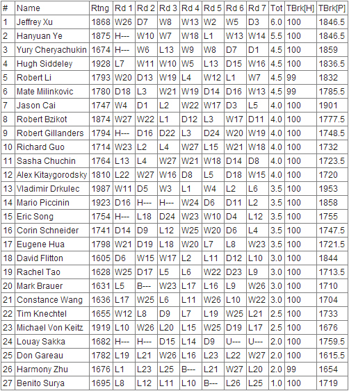 "XuVeZhYe", lead by Jeffrey Xu, winner of the U1600 with 6/7, won the team tournament, at 19/28, only half a point ahead of Peredune's chess Academy (18,5).