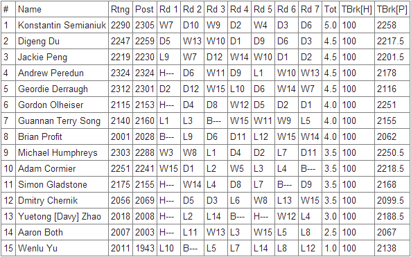 The Canadian Amateur and Senior Chess Championships took place in Kitchener from August 2 to August 5. It was a 7-round swiss tournament, divided in five sections : seniors open, amateur open, U2000, U1600 and U1200. They were fighting for a ~$3000 prize pool ($300-$200-$100 prizes for each amateur section). There were also two side-competitions for teams (teams of four, max 2/section) and family (teams of two).
