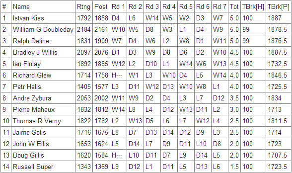 The Senior Championship crowned three winners, tied at 5/7 : Istvan Kiss, 1792, who scored 4,5 out of his last 5 games, William G. Doubleday, 2184, and Ralph Deline, 1831.