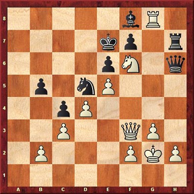 Unfortunately for Black, in chess you have to take turns. Black tried 34... Rg7, and Eric won as follows: 35. Nxd5+ exd5 36. Qf6+ Qxf6 37. exf6+ Kxf6 38. Rxf8 b4 39. Re8 b3 40. Kf3 Kg6 41. Re5 f6 42. Rxd5 Ra7 43. Rc5 Ra2 44. Rxc4 Rxb2 45. Rb4 Rb1 46. Rb5 b2 47. Kg4 f5+ 48. Kf4 Kh5 49. f3 Kg6 50. Rb6+ 1-0
