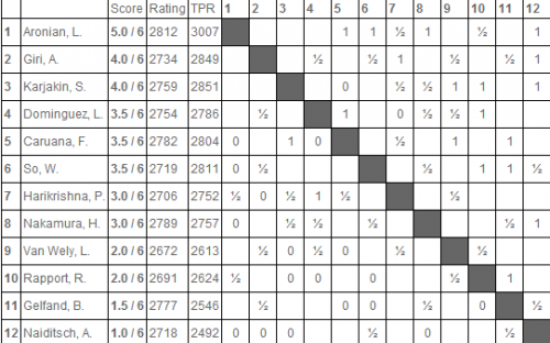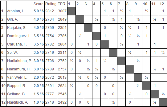 After the sixth of eleven rounds, Levon Aronian (Armenian, 5/6) is a full point ahead of Anish Giri and Sergei Karjakin (Both Russians, 4/6). Both Aronian and Karjakin will play in the Candidates Tournament in March. The other favorites were Caruana (Italia, 3,5/6), Nakamura (USA, 2/6) and Gelfand (Russia, 1,5/6). The lowest rated player of the competition, Loek Van Wely (Netherlands), who will be playing in the 2014 Canadian Open in Montreal, shares 9th place with 2/6. See complete standings below.