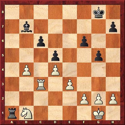 34. Rb3! Ba6 35. b5! The key defensive move: gives up a pawn in return for a piece-saving tempo.