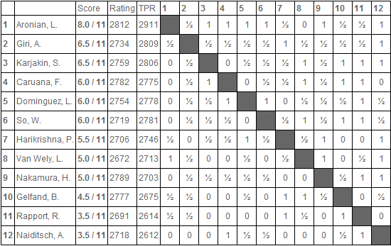 The Tata Steel Chess Tournament (Formerly Wijk Aan Zee) came to an end yesterday, January 25. Armenian Grandmaster Levon Aronian dominated the competition with a 8/11 score worth a 2911 rating performance. His only loss was to the hands of local favorite Loek Van Wely, who will be playing in the next Canadian Open. Aronian commented afterwards that he regrets having spoiled his most interesting game (see below). Runner-ups are Sergei Karjakin and the undefeated Anish Giri, at 6,5/11. Both Karjakin and Aronian will be playing in the Candidates Tournament in March. The Aronian last round loss and the complete standings follow.