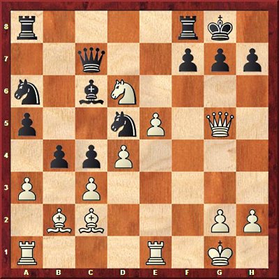 The game continued: 25. Bxh7+!! Kxh7 26. Qh5+? Kg8 27. Re4 Qxd6! A good counter-sacrifice. It's not the only move here, but it forcibly changes the course of the game: now White will have to consolidate and beware Black's active pieces. Black has two other defences which need to be considered: 27...Nf6 and 27...g6: 27... Nf6?! 28. exf6 Bxe4 29. Nxe4 Qf4 [only move] 30. Ng5 Qe3+ [only move] (30... Qf5? 31. Rf1 Qg6 32. Qxg6 fxg6 33. f7+ entombs the K and sets up mate: Kh8 34. Rf4 +-.) 31. Kh1 Qd3 [only move] 32. fxg7 Kxg7 33. cxb4 with an initiative that Black can't stop with 33... c3 since 34. Bxc3! and White's attack keeps storming along. Black's other defence -- 27... g6!? -- isn't losing, but it leaves White with a comfortable choice: continue the attack or go for an endgame: 28. Rg4!? is the move that keeps the attack going, since if 28...Qd7 29. Rf1 and White has lots of pressure. 28. Qh6 seems to lead to very difficult-to-evaluate endgames: 28... f5 [only move] (28... f6? 29. Rg4+-) 29. Qxg6+ Qg7 30. Qe6+ Rf7 31. Rh4 Qxg2+!? (31... Nac7 32. Qxf7+ Qxf7 33. Nxf7 Kxf7 34. axb4 unclear) 32. Kxg2 Nf4+ 33. Kf2 Nxe6 34. Nxf7 Kxf7 Is hard to evaluate: unlike the variation with 31...Nac7, Black has an extra pawn, but White has an extra open file for his second R. 28. exd6 Nf6 29. Qe2 Shocked by Black's defence on move 27, White overlooks the superior 29. Qxa5! +/=. 29... Bxe4 30. axb4 Bd3 31. Qf3 Be4 32. Qf1 Bd3 33. Qf3 Black could reasonably play on, but was probably happy to get away with a draw, so: 1/2-1/2
