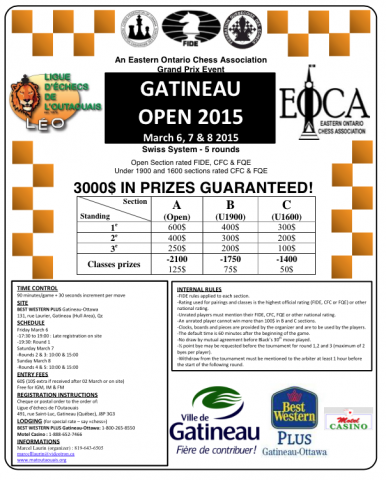 An EOCA Open grand prix event.The open section is FIDE, CFC and FQE rated. U1900 and U1600 sections are CFC and FQE rated.