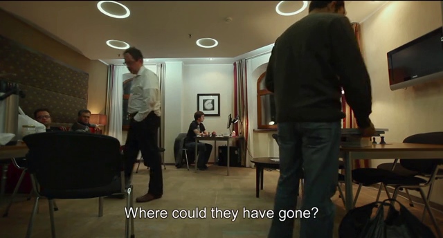 photo: Gelfand and his GM seconds look for missing pages of missing opening analysis in his Moscow hotel...
