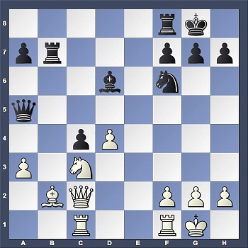 18. e4 $6 dxe4 19. Bxe4 Rb8 20. Qc2 Nf6 21. Bxb7 Rxb7 {Diagram [#]Critical