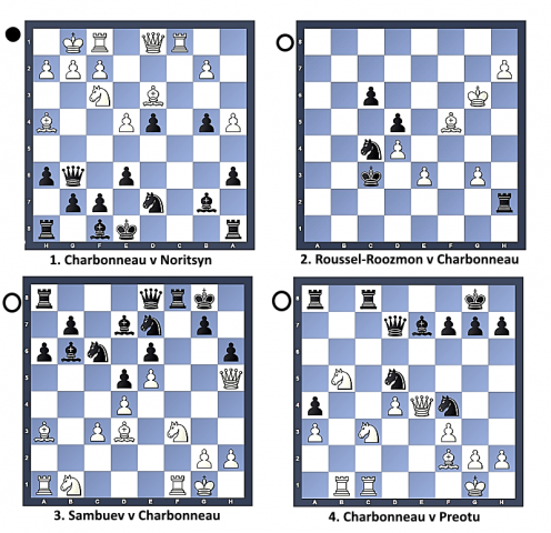On Wednesday January 11, 2017, the Toronto Dragons played the Montclair Sopranos. Charbonneau played, and so had 4 games against his fellow Canadians. The diagram shows four critical positions from each of those games. The side at the bottom is to move. Solutions can be found in the annotated games below.