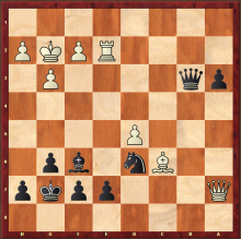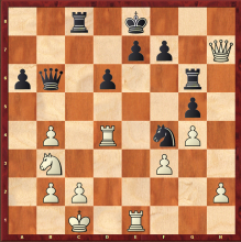 In this position, both kings find themselves under fire from their adversary’s heavy pieces. Black’s last move, 1. … Nf4, was a mistake, allowing white a thematic blow.