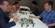 The 2018 Québec Open was held July 21-28, 2018, at the Sandman Hotel in Longueuil, Québec, just across the river from Montréal. GM Razvan Preotu (CAN) -- smiling in post-mortem photo with GM Cherniaev after their 8th round draw -- won with an undefeated 7.5/9, including wins over 2nd and 4th place GMs Edouard and Mikhalevski.